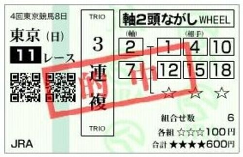 締め切り1分前に慌てて押さえ、どうにか空振りは免れたもののかなりの取りガミ。昨日の当たりがあったので数字上の土日収支はプラスですが、インクカートリッジ買った分を含めるとプラスは1000円未満という体たらくでございます(汗)。